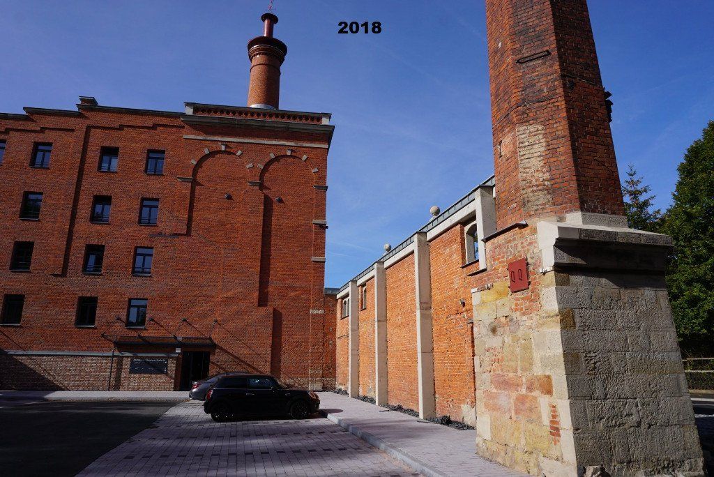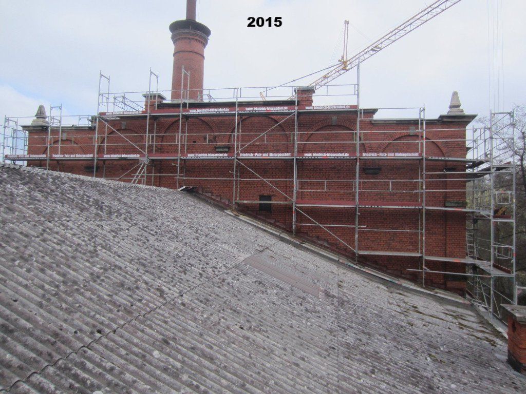 Das marode Maschinen- und Kesselhaus durfte in Abstimmung mit dem Denkmalamt abgerissen werden. Die Abdrücke des Satteldaches dieses Gebäudes sind nach dem Abriss noch sehr gut an der Fassade der Mälzerei zu erkennen (Bilder links, in der Mitte und Unten).