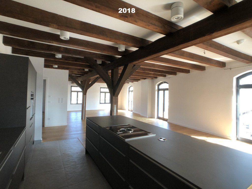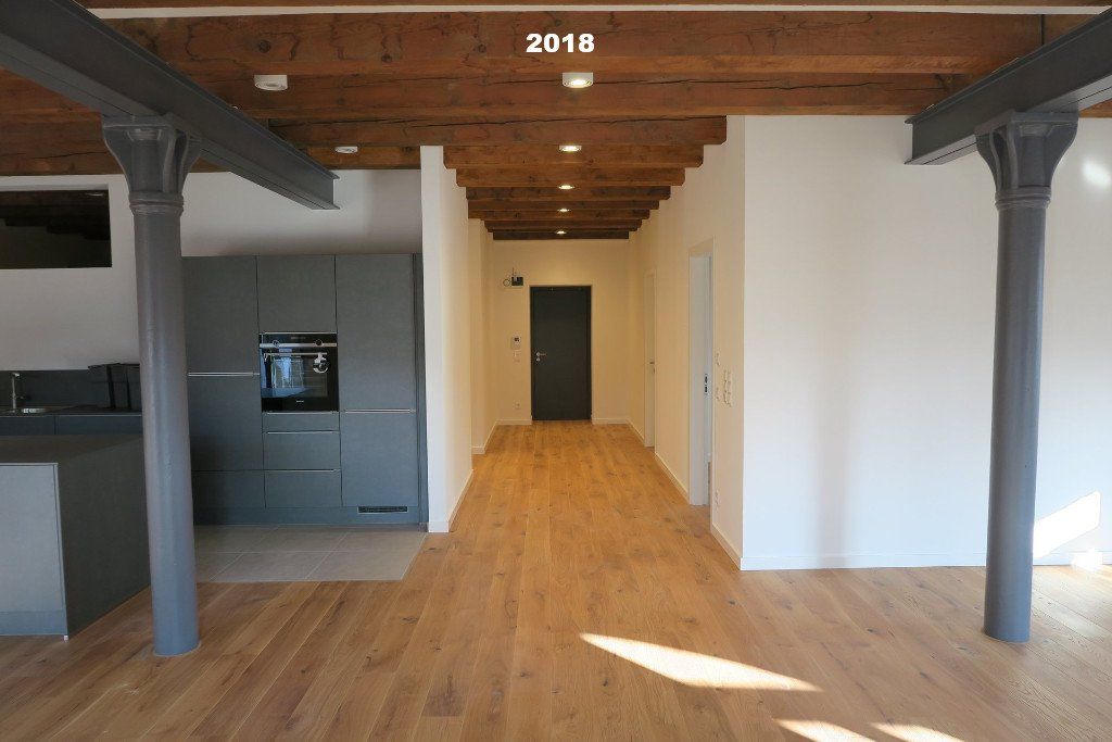 Obwohl viele Lofts vom Grundriss ähnlich sind, ist der Charakter jeder Wohnung anders. Auf dieser Etage z.B. wurden damals Eisenträger verbaut, die die Holzbalkendecke halten. Auch schwankt die Raumhöhe von Geschoß zu Geschoß. In dieser Wohnung beträgt die Raumhöhe zwischen den Deckenbalken 3,80 m.