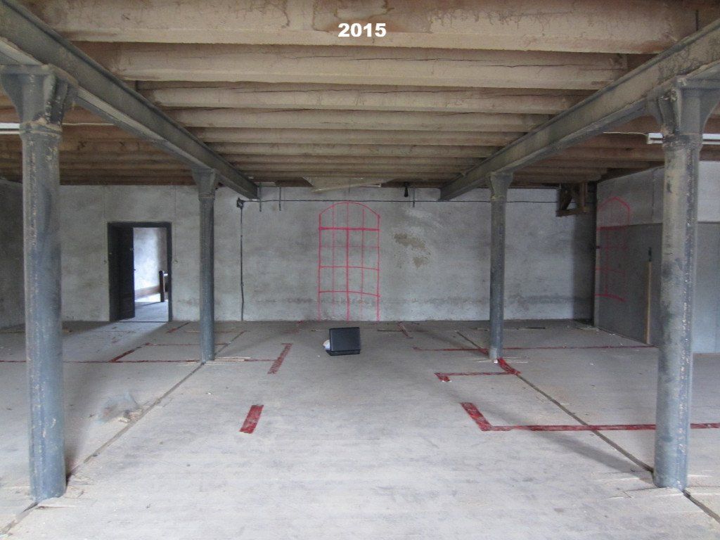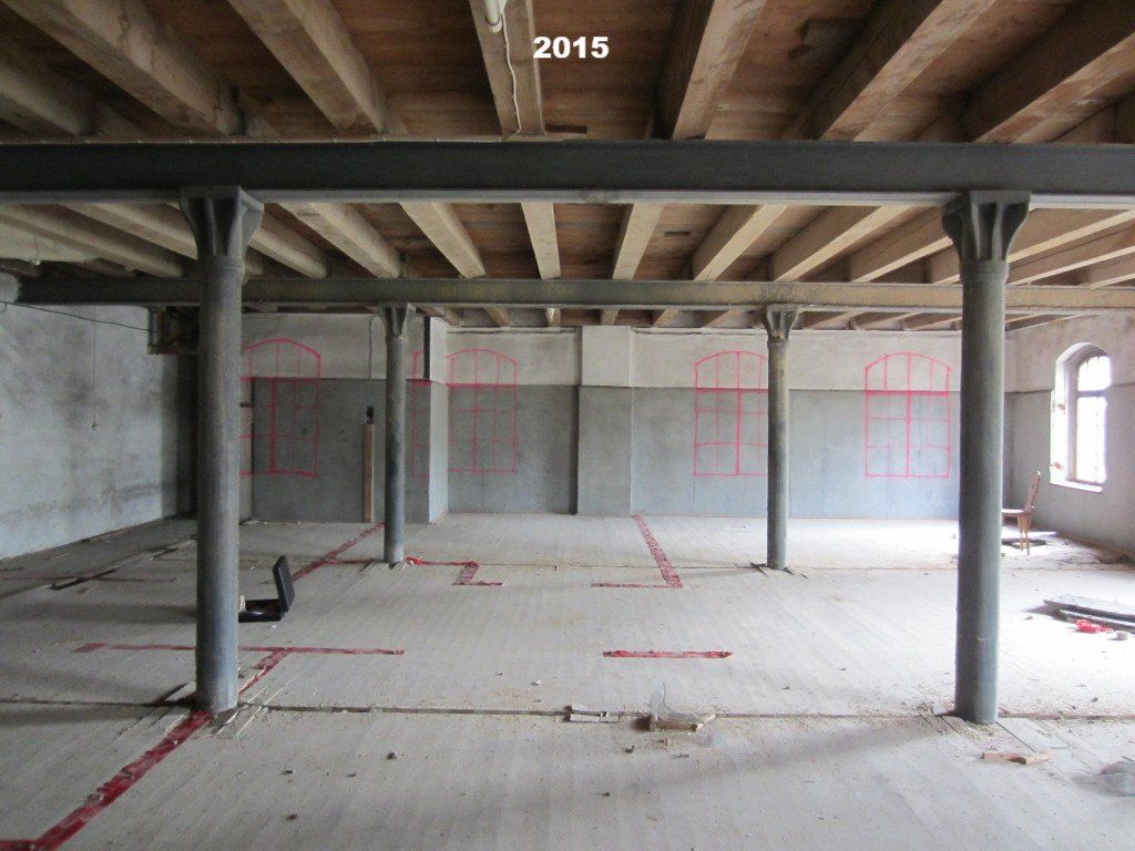 Das Loft 1.1 wurde zu Arbeitsräumen umgebaut. Auch hier wurden die Fenster zur Itz bodentief vergrößert. Bei der mittig geöffneten Fenstertür ist der Balkon zu erkennen. Die Eisensäulen und - stützen wurden angeschliffen und erhielten einen 3- fach Anstrich. Die Gewölbedecken wurden glatt gespachtelt und weiß gestrichen.