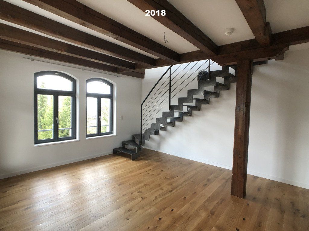 Die straßenseitige Hälfte des ehem. Gerstenbodens auf der 2. Ebene wurde zu Arbeitrsräumen umgebaut. Das Dach wurde neu aufgebaut und erhielt eine Dämmung. Alle Holzbalken wurden gereinigt und mit einen unbedenklichen Holzöl von Osmo neu eingelassen. Auf dem Bestandsboden wurde eine Wärme- und Trittschalldämmung mit einer Fußbodenheizung verlegt, auf die dann ein Zementestrich aufgebracht wurde.